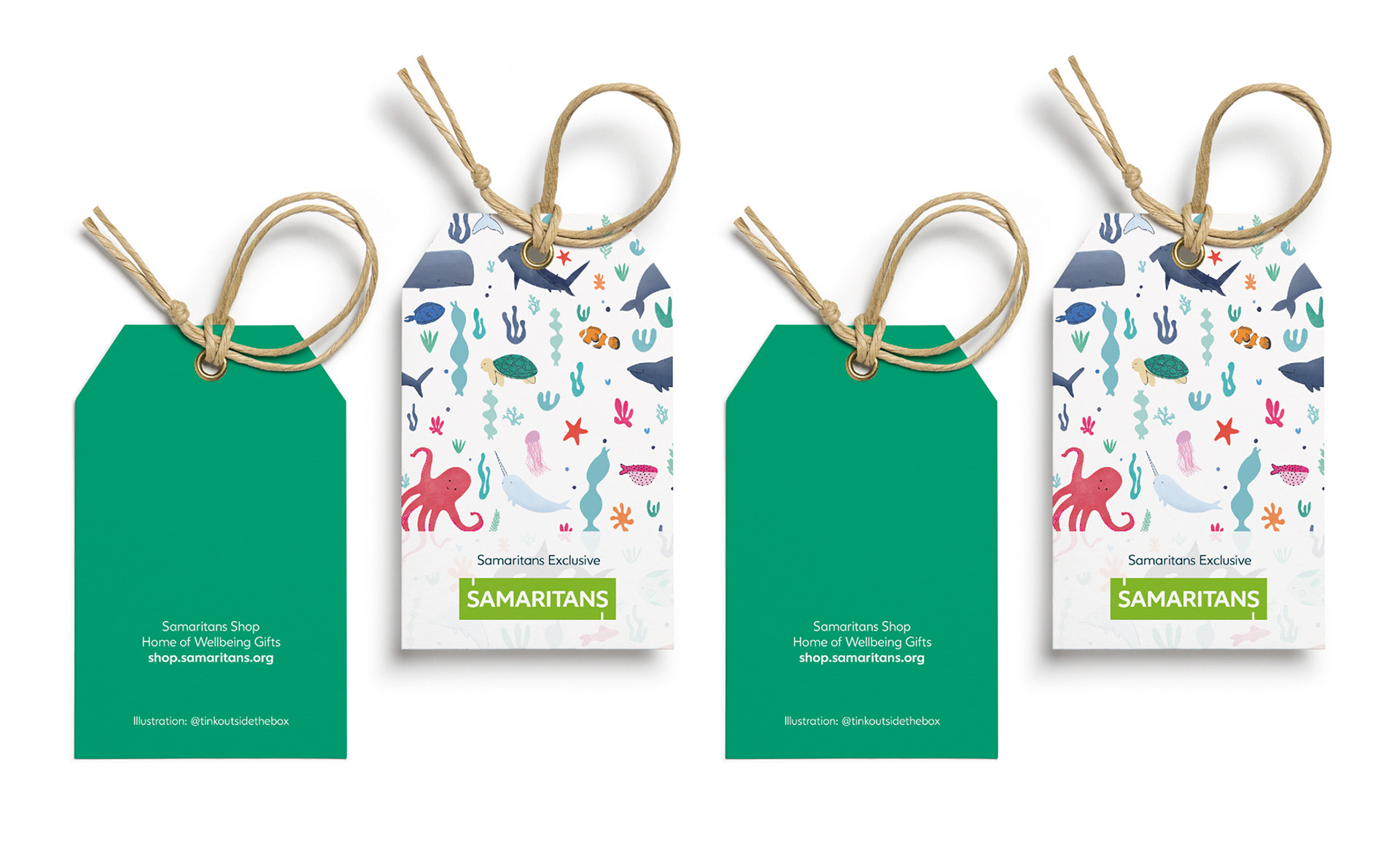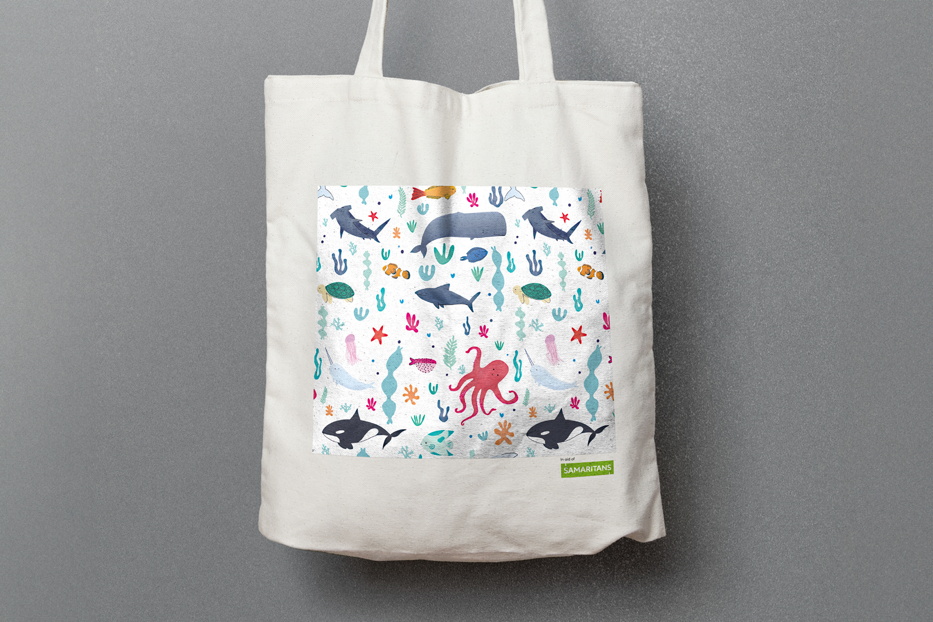 Using a commissioned 'Under the Sea' illustration, I created an engaging suite of branded merchandise. Showcasing the pattern in all its glory, these wellbeing gifts are designed to support people going through difficult times.